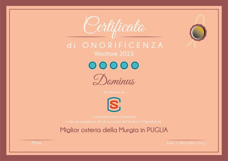 Siamo orgogliosi di festeggiare assieme a voi uno straordinario traguardo raggiunto dalla nostra azienda nell’anno appena concluso: il certificato di onorificenza che vede Dominus Osteria primeggiare come “Miglior osteria della Murgia in PUGLIA 2023“!